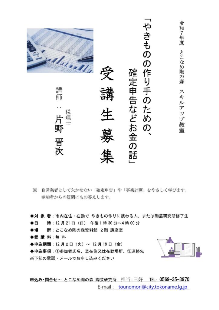 『やきものの作り手のための、確定申告などのお金の話』 受講生を募集いたします。